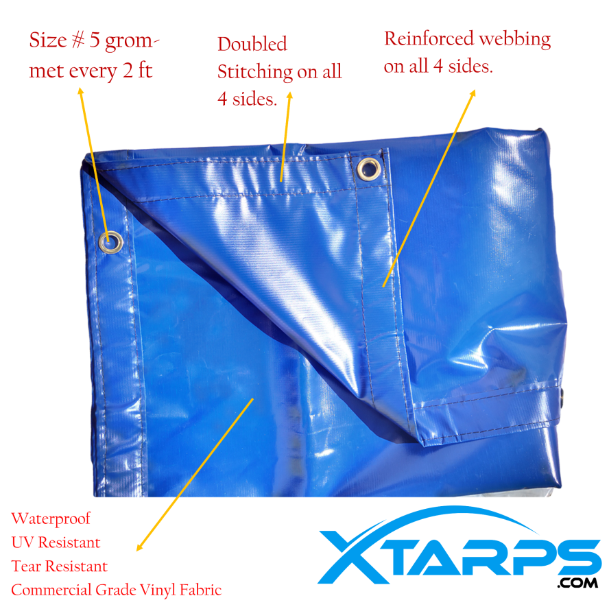 Xtarps - 10 x 24 - Blue Color 18oz Heavy Duty WaterProof Vinyl Trailer Tarp with 10 pcs 9" Rubber Bungee
